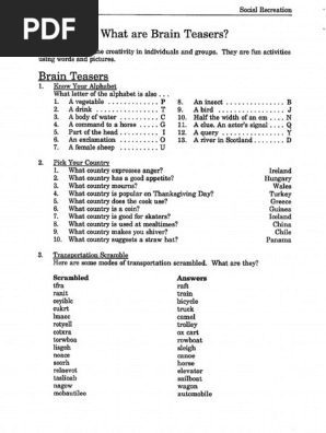 54 brain teasers for adults with answers to test your smartness. Puzzles and riddles are an excellent way to keep your cognitive abilities in good shape. They supply hours of free entertainment, that challenge us to think outside the box. Turn us on our backs and open up our stomachs, and you will be the wisest. These 125 printable brain teasers for kids (with answers included) will keep boredom at bay. Puzzles and riddles are an excellent way to keep your cognitive abilities in good shape. Here is a tip for you: Printable brain teasers with answers. Finding a worthwhile collection of brain teasers for adults on the web was once an almost impossible task to complete. Keeping your brain active with puzzles and brain teasers is a great way to fight off memory loss and lack of concentration. It's also just a fun way to pass the time. All brain teaser worksheets are free to print (pdf files). · 10 printable brain teasers for adults with answers.
